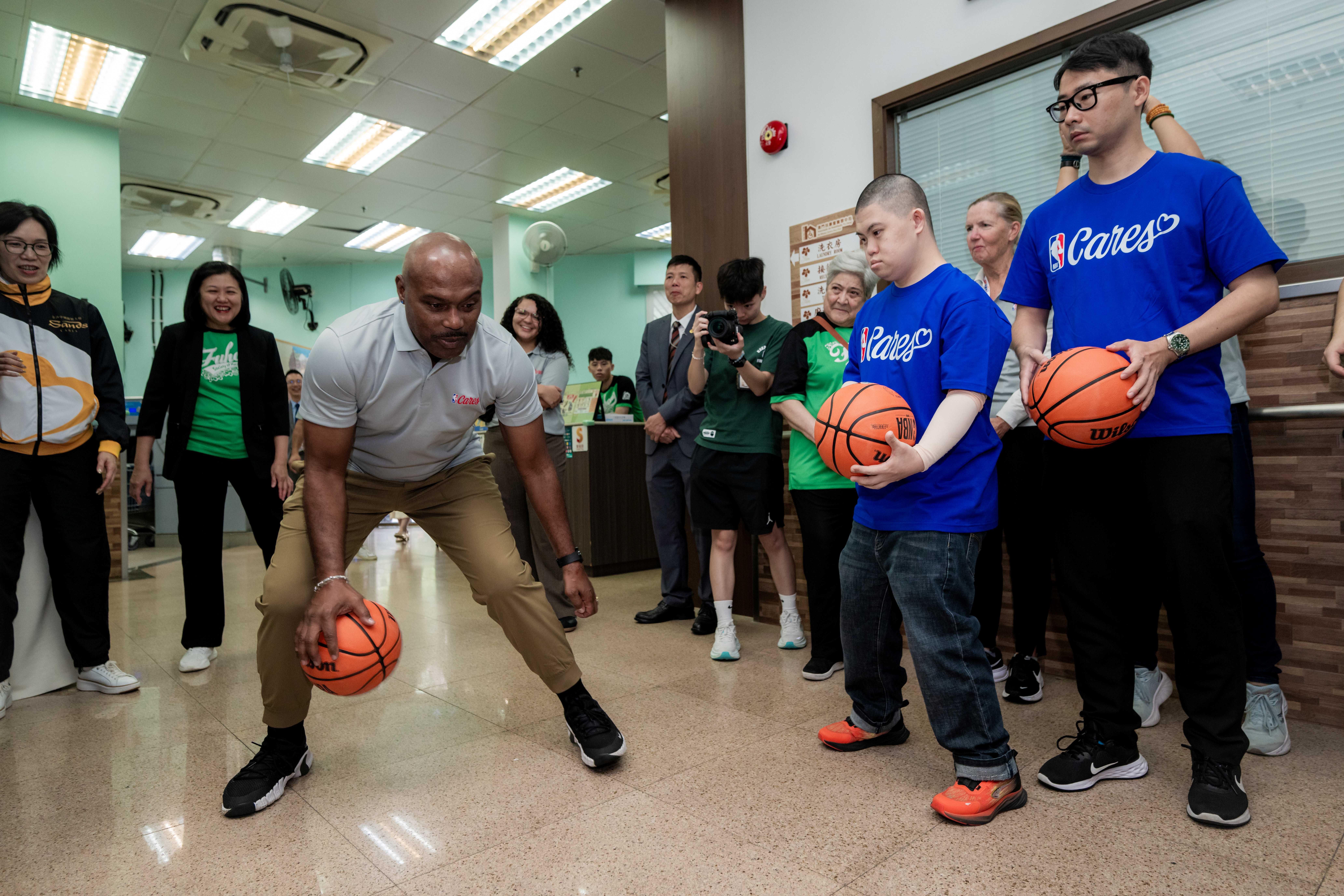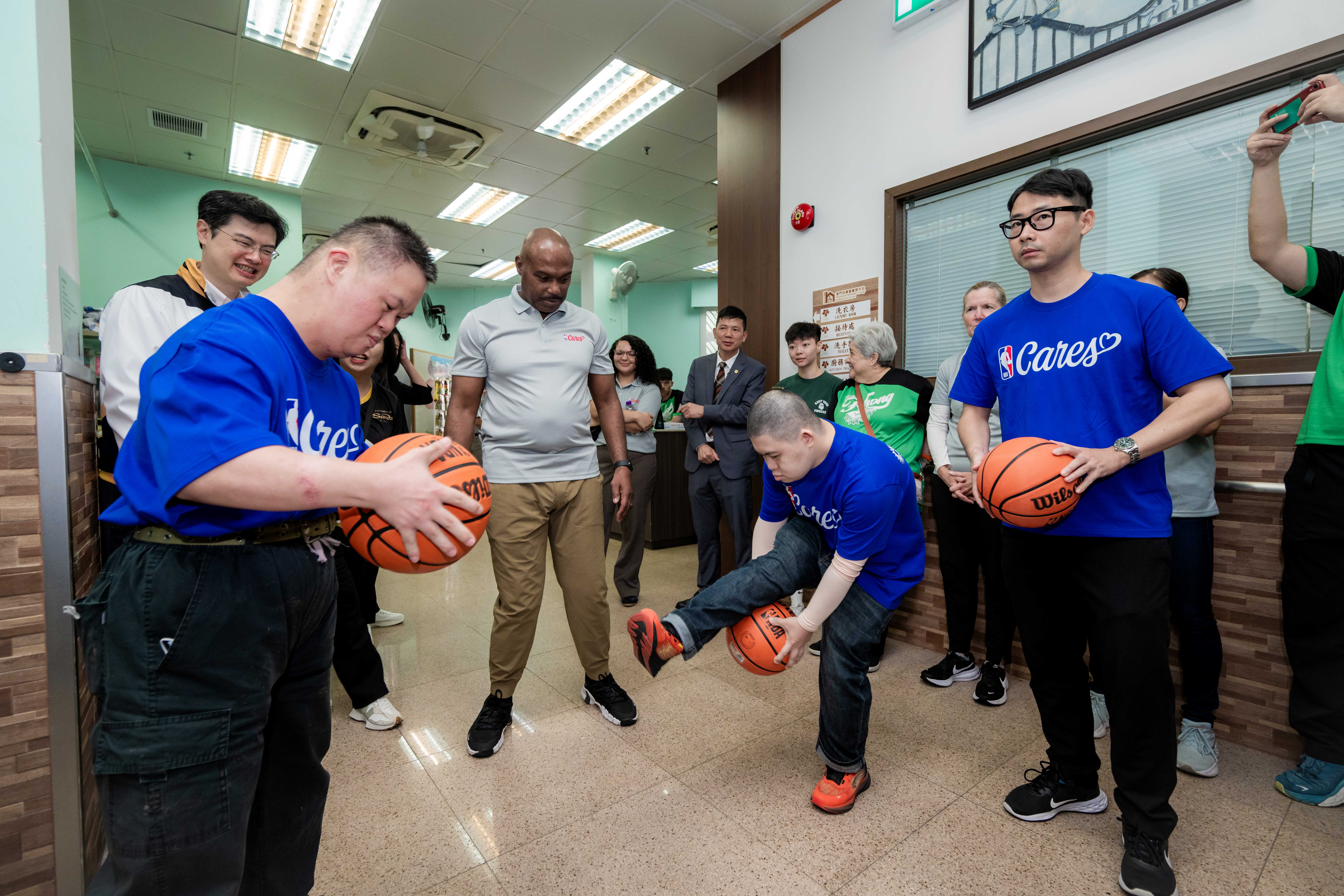 圖片説明: NBA傳奇球星添‧夏達威周五於澳門扶康會寶翠中心參觀期間施展球技,並與扶康會會員進行互動。