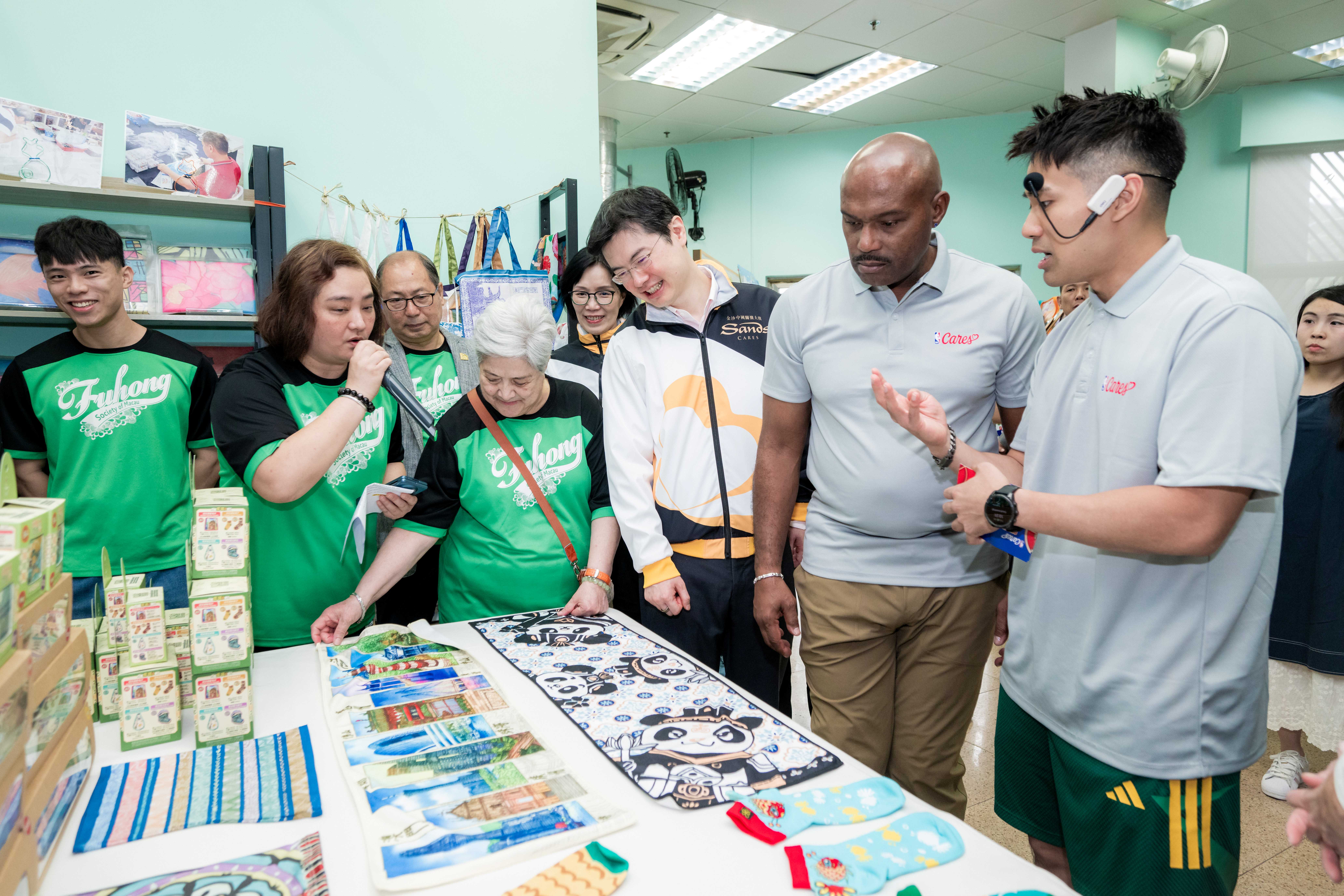 一眾參加者在澳門扶康會代表的介紹下先參觀中心的各項設施,了解該會的多元化服務。參觀期間,添‧夏達威更向扶康會會員施展球技,並與他們進行互動。隨後,他們一同在中心屬下的「葡角」訓練餐廳,為200名本澳弱勢人士分發愛心午餐。此外,他們亦向受惠者送上於公益周啟動儀式上製作的健康用品禮包,身體力行向本澳社區傳遞關愛和溫暖。