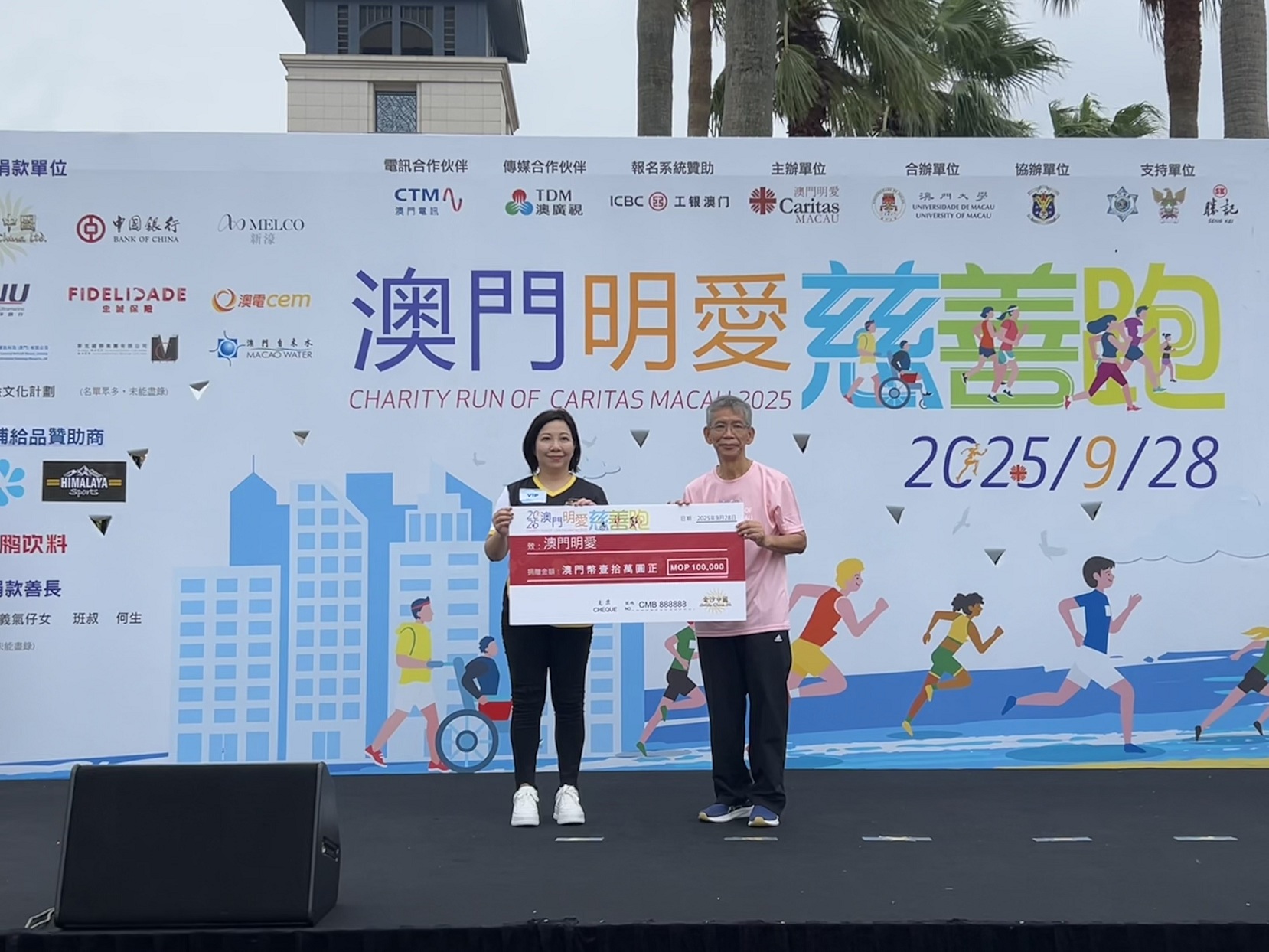 2025澳門明愛慈善跑 金沙中國社會事務總監林妤庭於9月28日在澳門大學舉行的支票捐贈儀式上,將澳門幣10萬元的善款交予澳門明愛總幹事潘志明,以支持「2025澳門明愛慈善跑」。金沙中國關懷大使亦出席了支票捐贈儀式,並一同參與5公里健康跑,藉此推廣健康生活、促進社區共融及家庭和諧。