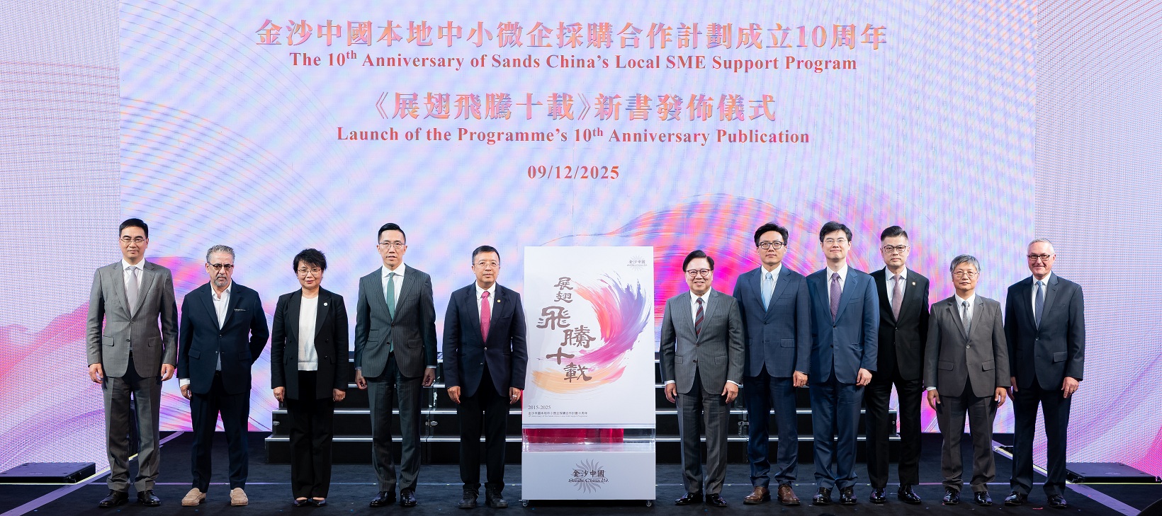 (澳門,2025年12月9日) – 金沙中國周二假澳門倫敦人®舉行「金沙中國本地中小微企採購合作計劃」成立10周年慶典,匯聚計劃的中小企,回顧相互協作十載的進程與建樹,並於當天發布合作計劃十周年紀念特刊,為這段共勉共進之路留下珍貴紀錄。同場亦舉行年度「2025金沙卓越供應商頒獎禮」,以表揚七家供應商的傑出表現,並向40家長期合作的中小企授予感謝狀。會場亦設商務聯誼環節,讓本地企業與公司部門代表會面,藉此促進更多互惠共贏的合作機遇。