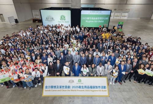 金沙中國有限公司周四組織330名團隊成員以及來自聖若瑟大學、澳門可持續發展協會、澳門樂施會及澳門義務青年會的義工,於澳門威尼斯人金光會展為社會企業潔世(Clean the World)製作30,000 個衛生用品福袋,連續12年與本地社服機構攜手支持潔世推動社區衛生工作。